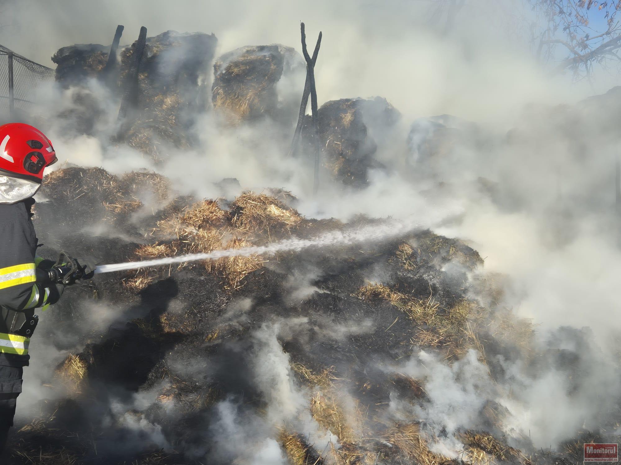 Alarma a fost dată chiar de proprietar, care a observat că iese fum din mijlocul depozitului de furaje.