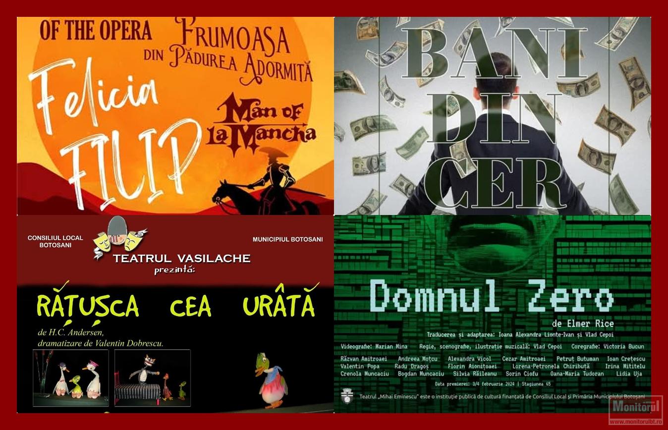 Sâmbătă, de la ora 19:00, actorii Teatrului „Mihai Eminescu” vor juca în piesa de teatru „Bani din cer” de Ray Ray Cooney. Din distribuție fac parte actorii: Dana Bucătaru (în rolul lui Jean Perkins), Sorin Ciofu (în rolul lui Henry Perkins), Ioan Crețescu (în rolul lui Bill), Gheorghe Frunză (în rolul lui Davenport), Loredana – Petronela Chiribuță (în rolul lui Betty Johnson), Răzvan Amitroaei (în rolul lui Vic Johnson), Vali Popa (în rolul lui Slater) și Petruț Butuman (în rolul unui trecător). Regia artistică şi coloana sonoră au fost asigurate de Alexandru Vasilache. Scenografia a fost realizată de Mihai Pastramagiu.