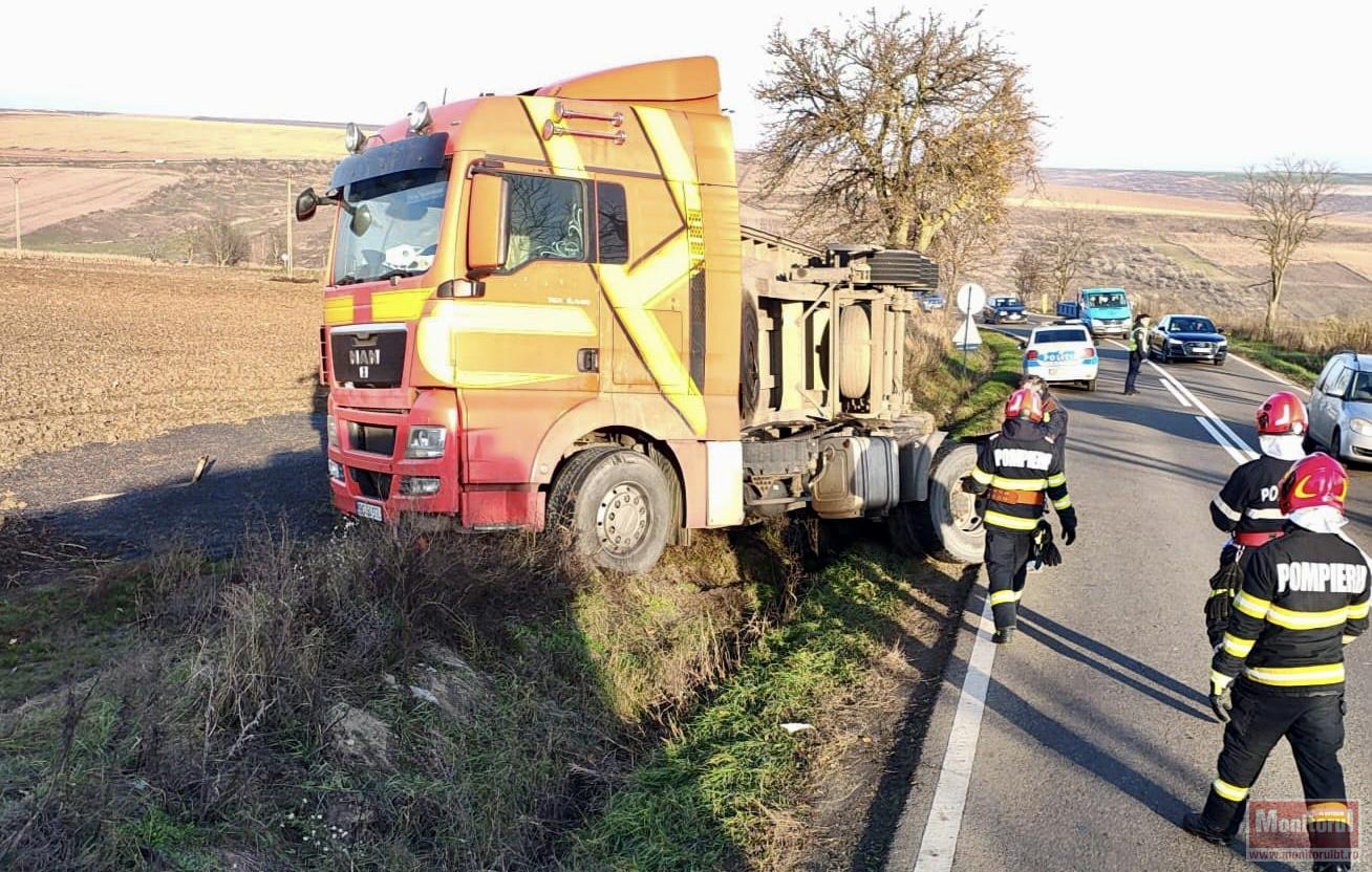 În urmă cu puțin timp, pompierii din cadrul Detașamentului Botoșani au fost solicitați să intervină la un accident rutier produs pe DN 24, pe ruta Botoșani – Săveni, unde un camion încărcat cu aproximativ 25 de tone de semințe de floarea-soarelui s-a răsturnat în afara părții carosabile.