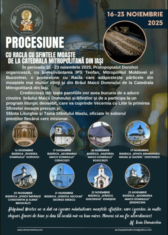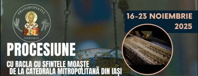 Protopopiatul Dorohoi va găzdui, în perioada 16–23 noiembrie 2025, una dintre cele mai importante manifestări duhovnicești din zona de nord a județului: procesiunea cu racla Catedralei Mitropolitane din Iași, care adăpostește părticele din moaștele mai multor sfinți, precum și o parte din Brâul Maicii Domnului. Evenimentul este organizat cu binecuvântarea IPS Teofan, Mitropolitul Moldovei și Bucovinei.