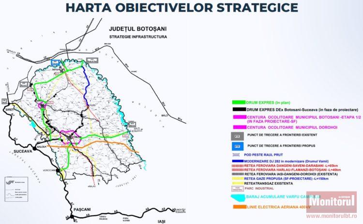 Cel mai mare plus al raportului pare prezentarea în premieră a unei hărţi integrate cu OBIECTIVELE STRATEGICE ale judeţului Botoşani. Aici sunt incluse drumuri expres, centuri ocolitoare ale municipiilor Botoşani şi Dorohoi, proiecte de conexiuni cu viitoarele autostrăzi A7 şi A8, planuri pentru magistrale de gaz şi reţele electrice de înaltă tensiune. Tot aici se regăsesc noul pod peste râul Prut, noua sursă de alimentare cu apă a judeţului (Acumularea Vârfu Câmpului), planuri pentru parcuri industriale şi noi reţele feroviare (cea mai importantă fiind noua linie Botoşani-Flămânzi-Hârlău).