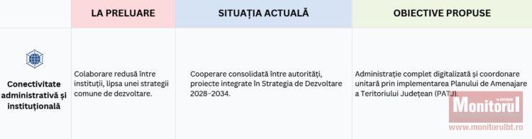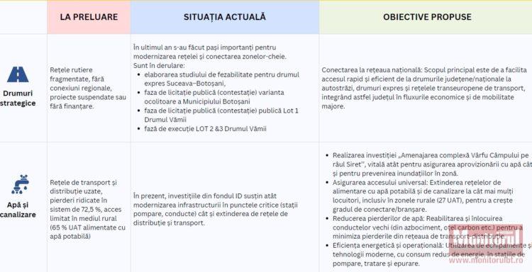 Pe final, pe fiecare dintre direcţiile strategice, sunt prezentate situaţia obiectivelor la preluarea mandatului, care este starea lor la un an de mandat al lui Valeriu Iftime, dar şi care sunt ţintele propuse.