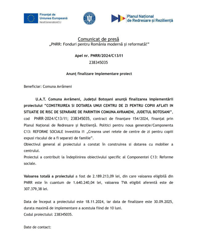 Anunţ încheiere proiect PNRR