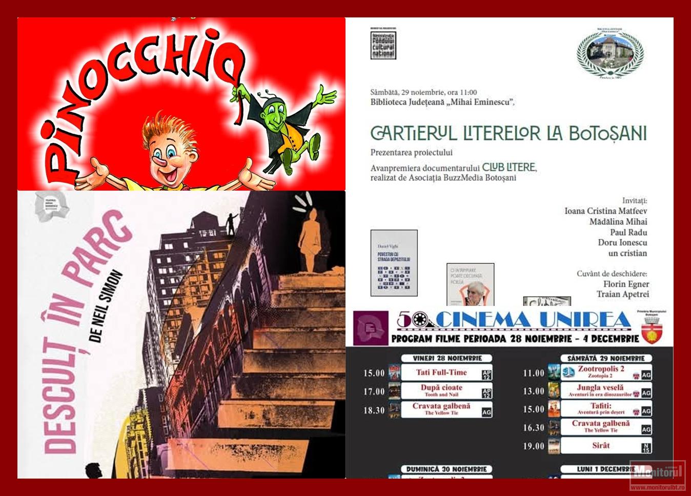 Ultimul weekend al lunii noiembrie își deschide porțile cu o agendă culturală bogată pentru botoșăneni: de la o proiecție-documentar care readuce la viață atmosfera boemă a Clubului Litere din subsolul Facultății de Litere din București, până la premiere teatrale, spectacole pentru cei mici și cele mai noi titluri din cinematografe. Oferta este variată, iar instituțiile de cultură mizează pe un public care caută atât povești cu nostalgie universitară, cât și comedii clasice sau filme pentru întreaga familie.