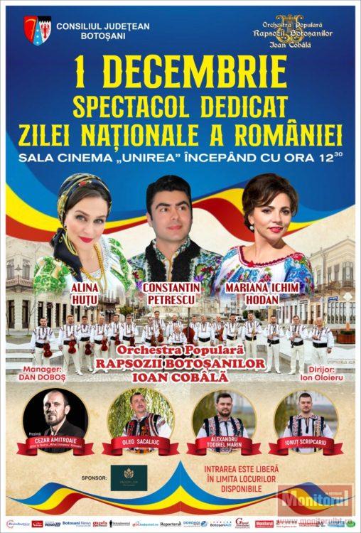 De la ora 12.30 la Cinema Unirea are loc Spectacolul dedicat „Zilei Naționale a României”, cu Rapsozii Botoşanilor şi îndrăgite vedete locale.