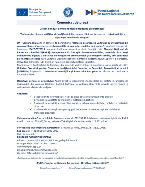 Comunicat de presă – „PNRR Fonduri pentru România modernă și reformată!” – ”Dotarea și echiparea unităților de învățământ din comuna Hlipiceni în vederea creșterii calității și siguranței mediilor de învățare”