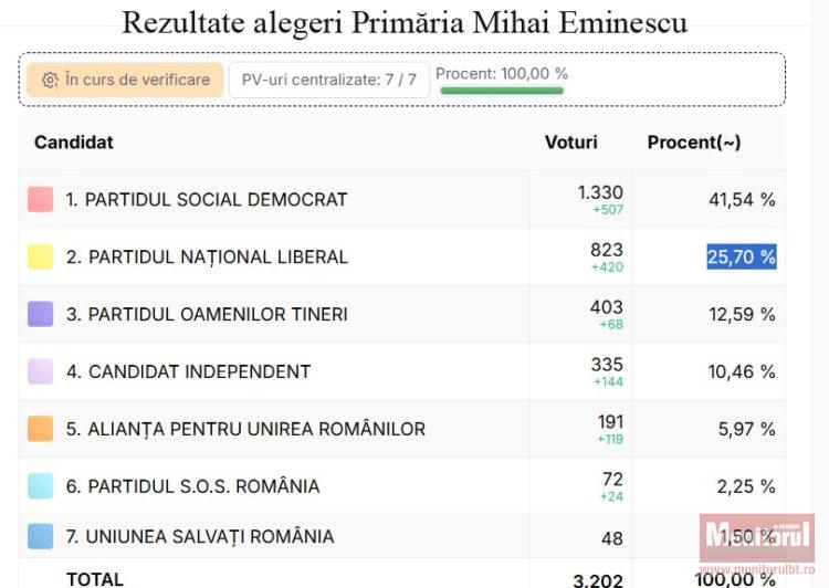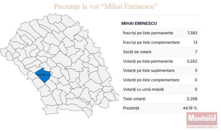 Andreea-Cristina Alecu-Gireadă (PSD) este noul primar al comunei Mihai Eminescu. După numărarea tuturor opţiunilor din cele şapte secţii de votare din comună, fiica fostului primar Verginel Gireadă s-a impus cu 41,54% din voturi.