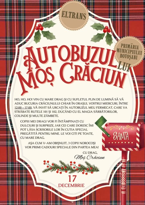 Botoșaniul intră în atmosferă de sărbătoare. Miercuri, 17 decembrie, între orele 12:00 și 17:00, pe traseele 101 și 102 va circula „Autobuzul Fermecat al lui Moș Crăciun”, un mijloc de transport decorat festiv, cu colinde, surprize și o cutie specială pentru scrisorile copiilor către Moș.