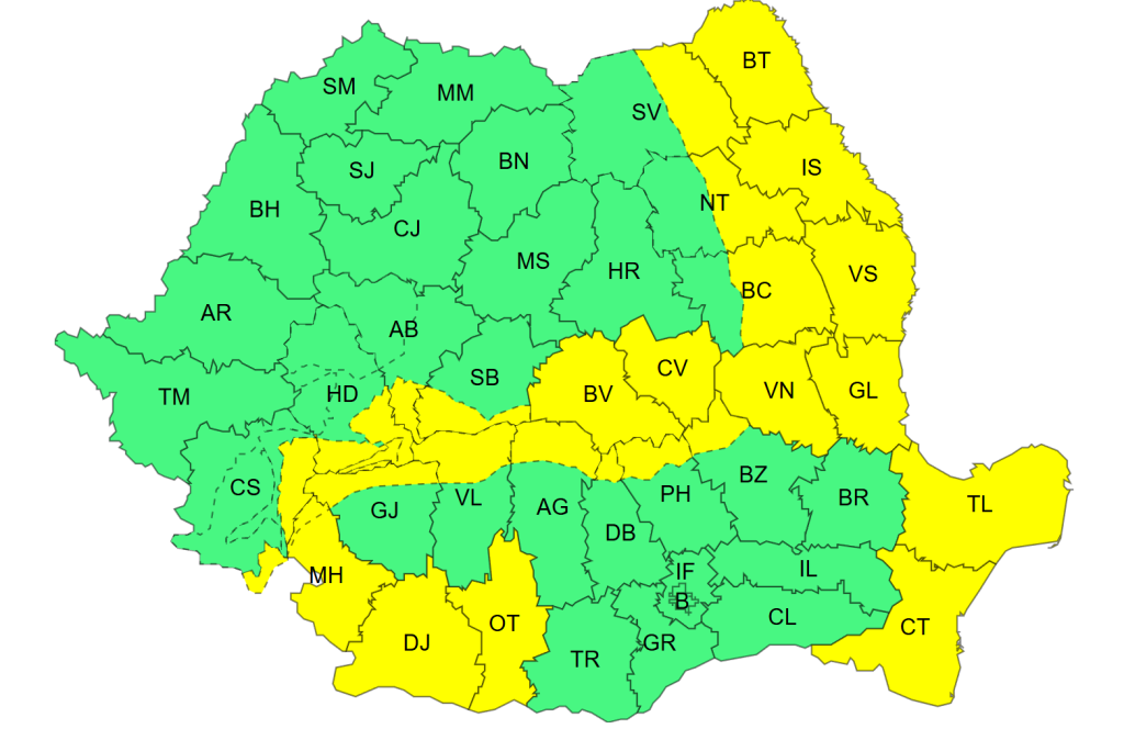 Primul cod galben de vreme rea este valabil între 29 decembrie, ora 10 – 29 decembrie, ora 23.