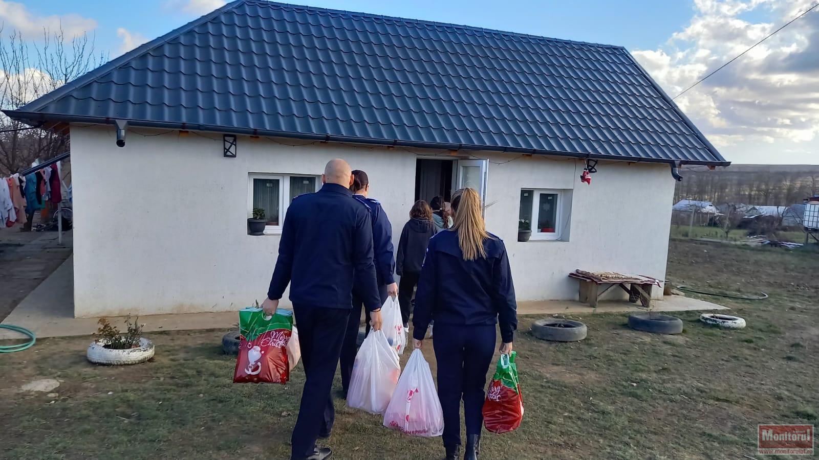 Jandarmii au fost întâmpinați cu emoție de mamă și de cele trei fete mai mari, în timp ce copiii mai mici se aflau la repetiții pentru obiceiurile tradiționale de sfârșit de an, semn că, în ciuda lipsurilor, familia păstrează vie bucuria sărbătorilor și tradițiile locului.
