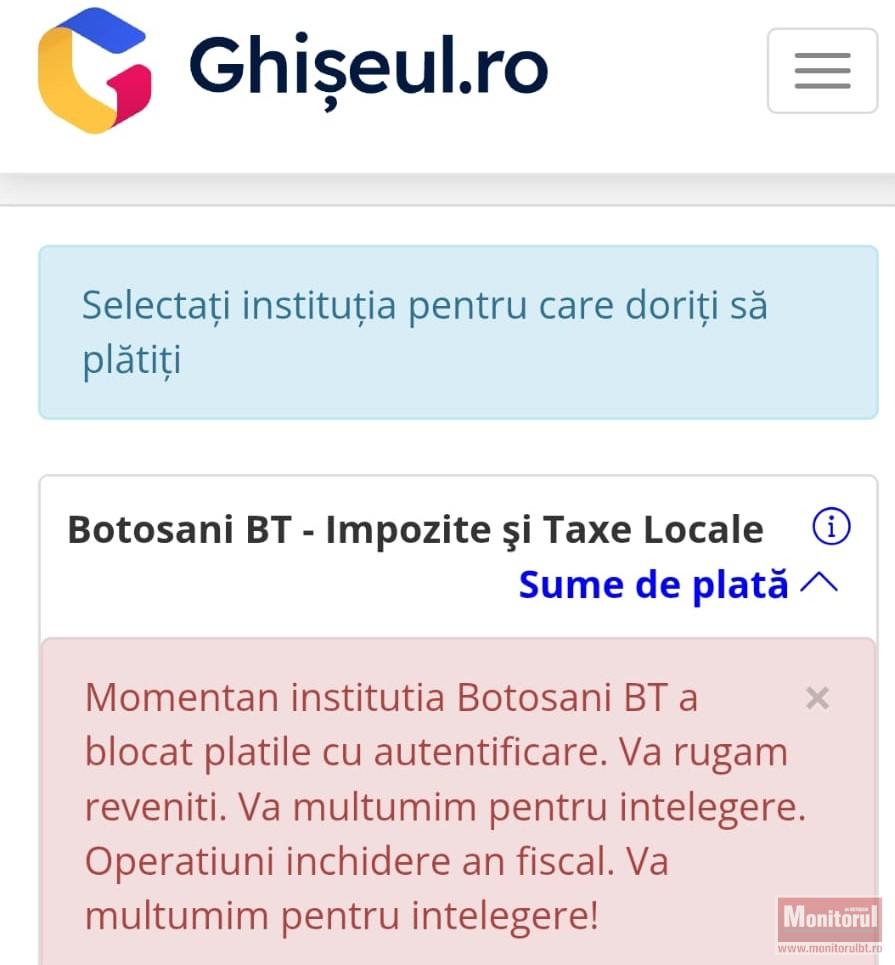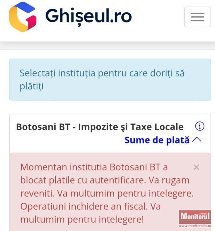 În prima zi lucrătoare din an, care este luni, 5 ianuarie, la Botoşani nu s-au putut plăti dările locale pentru anul 2026. Asta deoarece nu au fost deschise ghişeele pentru plata taxelor şi impozitelor locale, dar nu a funcţionat nici aplicaţia pentru plăţi online. Mesajul postat pe ghiseul.ro este “Momentan instituţia Botoşani BT a blocat plăţile cu autentificare. Vă rugăm reveniţi”.