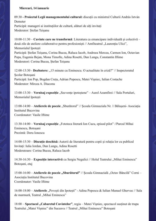 Miercuri, 14 ianuarie, programul continuă cu dezbateri despre actualitatea operei eminesciene, ateliere colaborative pentru profesioniști, lansări și vernisaje de expoziții la Memorialul Ipotești și în alte locații din oraș. Pe parcursul zilei sunt programate discuții deschise cu autori de literatură pentru copii, ateliere de poezie pentru elevi și expoziții interactive.