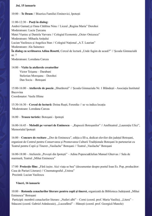 Ziua de 15 ianuarie, dedicată oficial Zilei Culturii Naționale, debutează cu un Te Deum la Biserica Familiei Eminovici din Ipotești. Programul continuă cu dialoguri între poeți și elevi în unități de învățământ din Botoșani și Dorohoi, cercuri de lectură, vizite la atelierele creatorilor și trasee turistice tematice.
