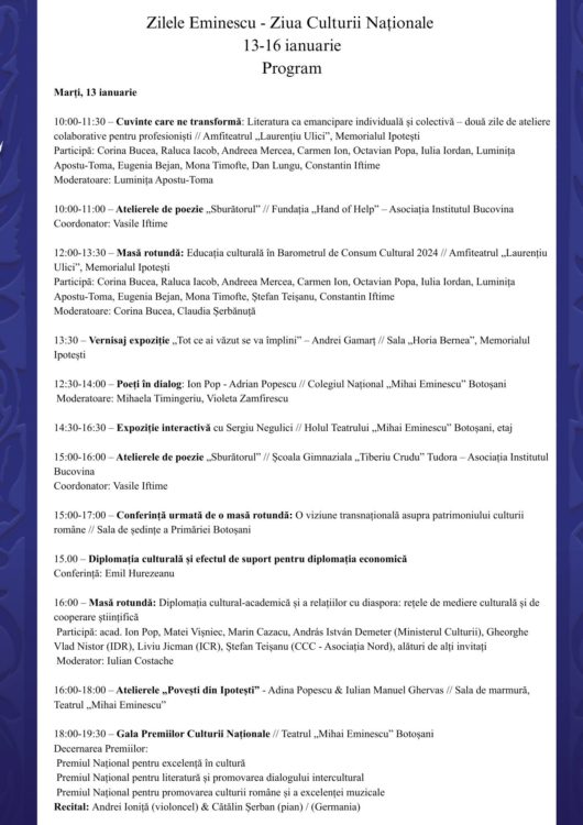 Seria evenimentelor debutează marți, 13 ianuarie, cu ateliere și mese rotunde dedicate literaturii și educației culturale, organizate la Memorialul Ipotești și în alte spații culturale. Pe parcursul zilei au loc atelierele de poezie „Sburătorul”, întâlniri între poeți și elevi, expoziții interactive și conferințe pe teme de diplomație culturală și patrimoniu.