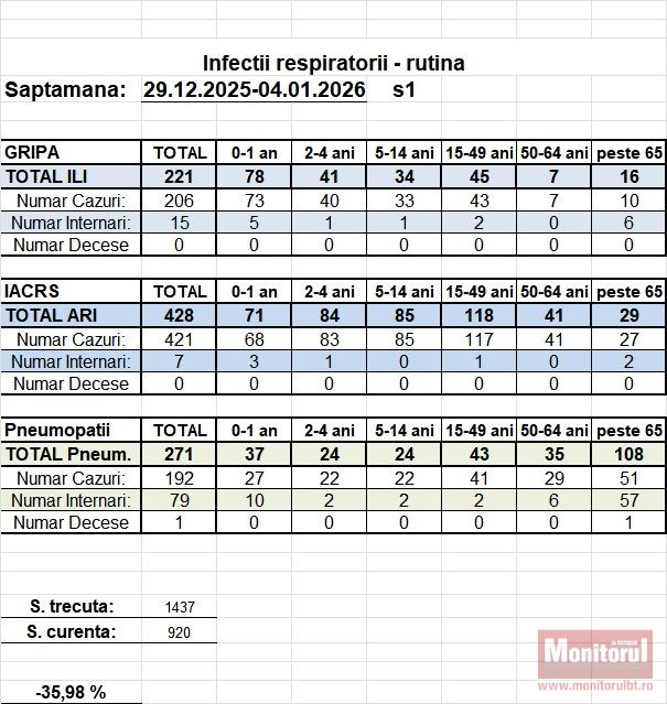 Cazurile de gripă au continuat să fie raportate într-un număr semnificativ în ultima săptămână a anului trecut, însă datele oficiale indică o scădere clară a infecțiilor respiratorii față de perioada anterioară. Potrivit raportării pentru săptămâna 29 decembrie 2025 – 4 ianuarie 2026, numărul total al îmbolnăvirilor respiratorii a fost de 920 de cazuri, în scădere cu aproape 36% față de săptămâna precedentă, când au fost înregistrate 1.437 de cazuri.