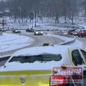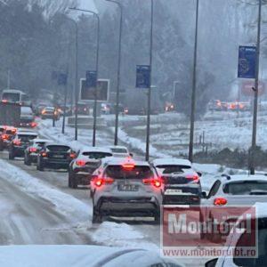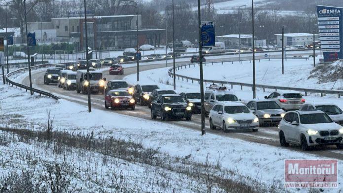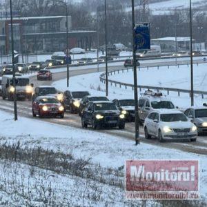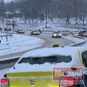 La intrarea în oraș, pompierii și polițiștii sunt prezenți și încearcă să deblocheze circulația, dirijând traficul și intervenind pentru degajarea vehiculelor rămase în pantă sau pe carosabilul acoperit de gheață. Intervenția autorităților se desfășoară în condiții dificile, pe fondul poleiului care continuă să creeze probleme serioase participanților la trafic.