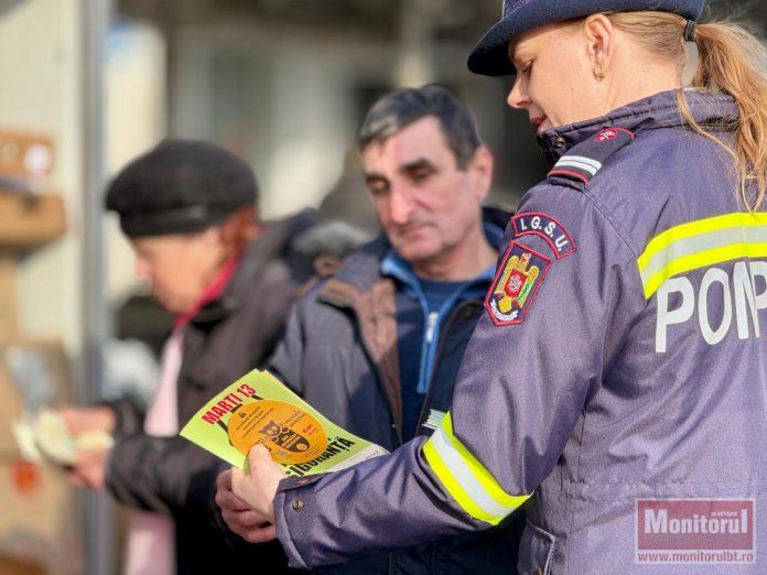 Pompierii botoșăneni au diseminat astăzi mesajul preventiv prin distribuirea de materiale aferente campaniei în locurile aglomerate din municipiul Botoșani și orașul Darabani, dar și în celelalte localități ale județului prin intermediul Serviciilor Voluntare pentru Situații de Urgență.