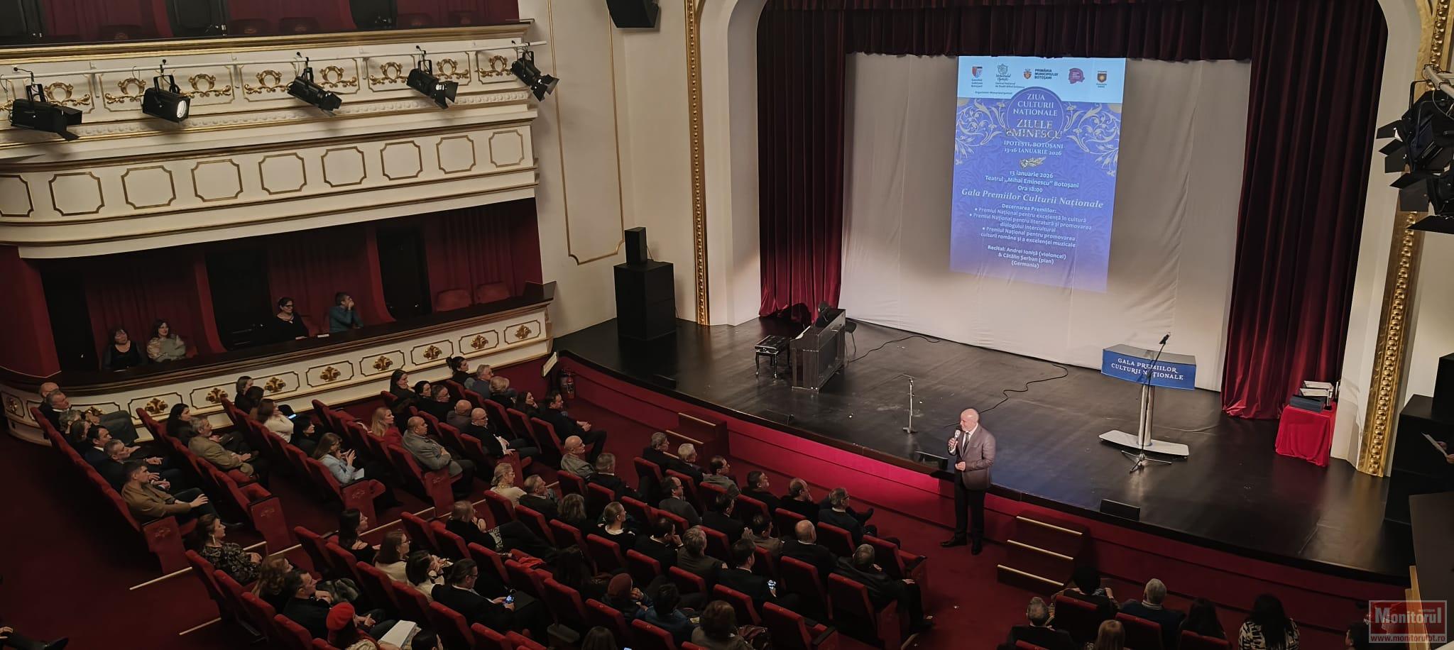 Seria marilor evenimente dedicate la fiecare mijloc de ianuarie poetului Mihai Eminescu şi Zilelor Culturii Naţionale au cuprins marţi seară la Botoşani şi Gala Premiilor Culturii Naţionale. Evenimentul face parte din Zilele Culturii Naţionale (13 – 15 iunie) şi sunt organizate de Memorialul Ipoteşti – Centrul Naţional de Studii „Mihai Eminescu”.