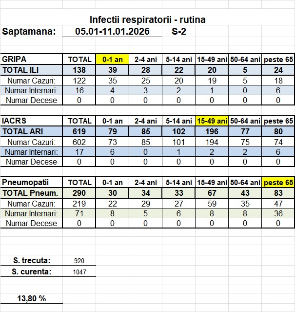 Datele arată o creștere a numărului total de infecții respiratorii față de săptămâna anterioară. Dacă în intervalul precedent au fost raportate 920 de cazuri, în săptămâna 5–11 ianuarie s-a ajuns la 1.047 de îmbolnăviri, ceea ce înseamnă o creștere de 13,8%.